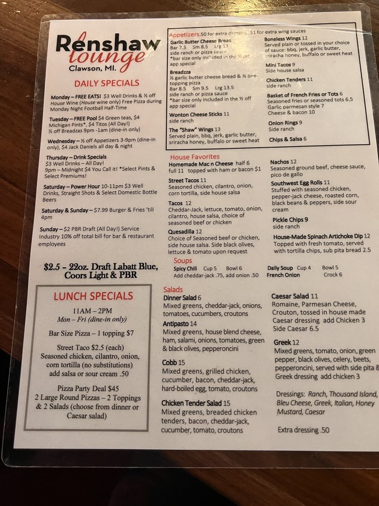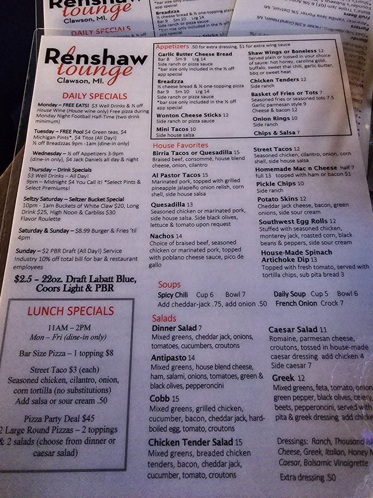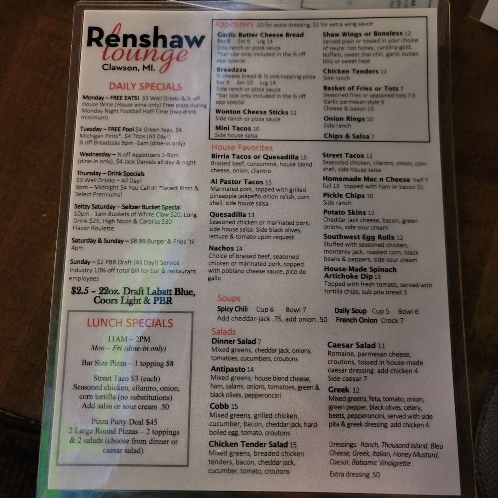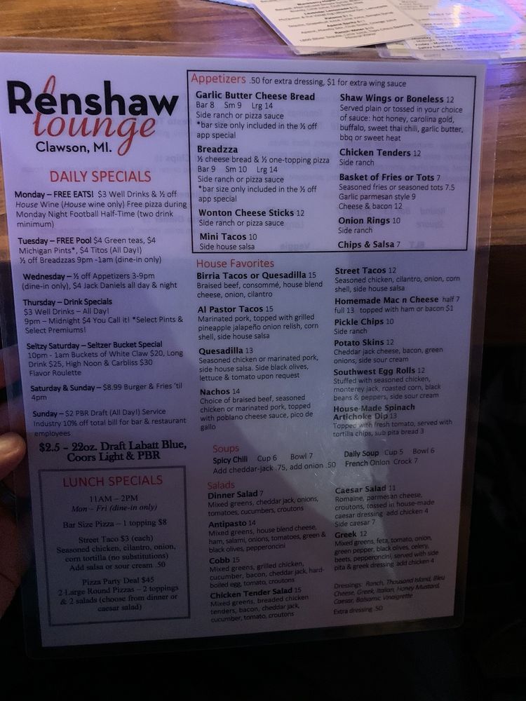 Renshaw Lounge, located in Clawson, MI, offers a casual and lively atmosphere perfect for sports fans and late-night diners. With a diverse menu including delicious pizza and bar favorites like wings and nachos, this spot is sure to satisfy your cravings. The lounge also features outdoor seating, a pool table, and a jukebox for entertainment. Customers rave about the attentive service, cold drinks, and tasty food options. The young and energetic vibe makes it a popular destination for both locals and visitors. If you're looking for a place to unwind, grab some good food, and enjoy a fun night out, Renshaw Lounge is the place to be.