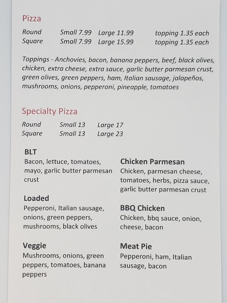 Green peppers, onions, black olives, mushrooms, banana peppers, tomato, lettuce, provolone, Swiss, side of pizza sauce